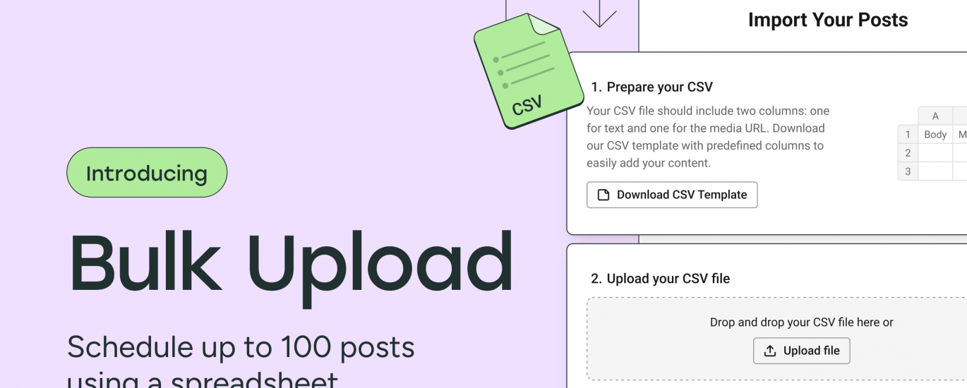 With Bulk Upload, that changes. You can now convert a spreadsheet into up to 100 scheduled posts. Rows become ready-to-go posts, so you can go from planning to publishing without the busywork.